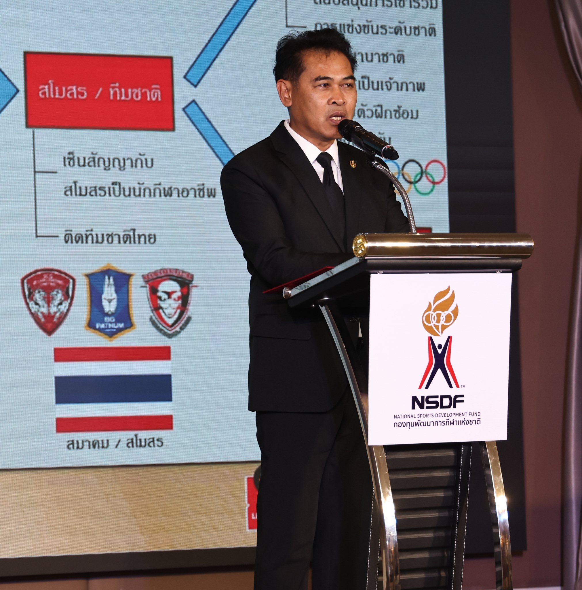 ด้านนายทนุเกียรติ จันทร์ชุม ผู้จัดการกองทุนพัฒนาการกีฬาแห่งชาติ กล่าวว่า “ก่อนอื่นผมขอเรียนถึงวัตถุประสงค์ของการจัดงานในวันนี้ ซึ่งสืบเนื่องจากนโยบายของรัฐบาลที่มอบหมายผ่านกระทรวงการท่องเที่ยวและกีฬา ให้หน่วยงานด้านกีฬาและสมาคมกีฬาต่าง ๆ ร่วมกันกำหนดแนวทางดำเนินงานเพื่อขับเคลื่อนการพัฒนากีฬาให้บรรลุเป้าหมายอย่างเป็นรูปธรรม การนำนโยบายไปสู่การปฏิบัติจำเป็นต้องอาศัยทั้งเวลา ความร่วมมือ และงบประมาณ กองทุนพัฒนาการกีฬาแห่งชาติได้หารือร่วมกัน และคณะกรรมการบริหารกองทุนได้เห็นชอบให้การสนับสนุนโครงการนี้อย่างต่อเนื่อง โดยปีนี้เป็นปีที่ 2 ของการดำเนินงาน แม้งบประมาณที่ใช้จะเป็นสัดส่วนเพียงเล็กน้อยเมื่อเทียบกับภาพรวม แต่ผู้ได้รับประโยชน์ครอบคลุมเยาวชน นักกีฬา และบุคลากรกีฬาจำนวนมาก รวมถึงระบบนิเวศกีฬาโดยรวม ความมุ่งหวังของโครงการ คือ การสร้างรากฐานที่แข็งแรงให้วงการกีฬาไทย พัฒนานักกีฬา บุคลากร และระบบการแข่งขัน เพื่อให้เกิดผลสัมฤทธิ์ในระยะยาว ทั้งในระดับทีมชาติ เวทีมหกรรมกีฬา อาทิ ซีเกมส์ เอเชียนเกมส์ และโอลิมปิกเกมส์ ตลอดจนการเปิดโอกาสสู่อาชีพนักกีฬา สร้างชื่อเสียงและความภาคภูมิใจแก่ครอบครัวและประเทศชาติ ผมเชื่อมั่นว่า ด้วยความร่วมมือของทุกภาคส่วน เป้าหมายที่เราวางไว้ร่วมกันจะบรรลุผลสำเร็จตามที่คณะกรรมการบริหารกองทุนคาดหวัง”