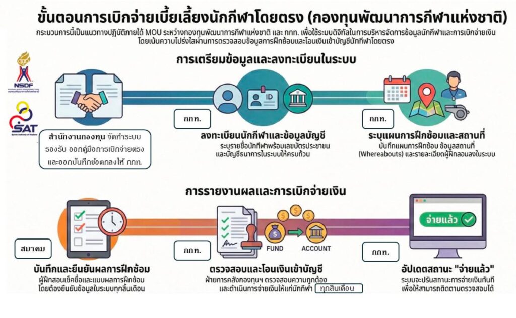 ที่ประชุมมีมติเห็นชอบขั้นตอนและรายการเบิกจ่ายตรงนักกีฬา เข้าบัญชีนักกีฬาโดยตรง (Direct Payment) เพื่อแก้ไขปัญหาความล่าช้าและเพิ่มความโปร่งใส โดยระบบดังกล่าวจะโอนเงินเข้าบัญชีนักกีฬาทุกสิ้นเดือน ลดขั้นตอนซ้ำซ้อน นักกีฬาได้รับเงินครบถ้วน สามารถบริหารจัดการค่าใช้จ่ายด้านโภชนาการ ที่พัก และการดูแลร่างกายได้อย่างเหมาะสม