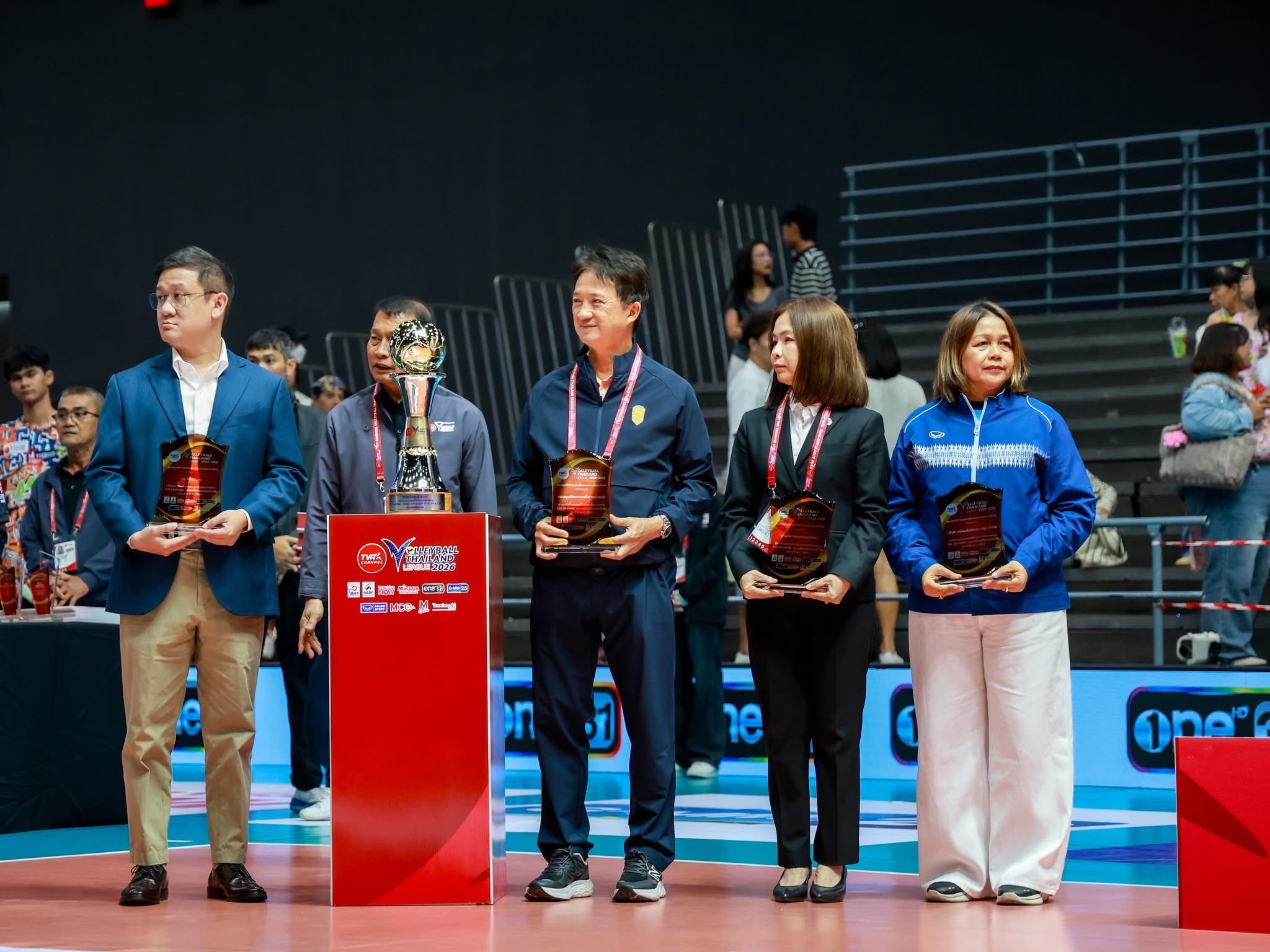 โดย นายทนุเกียรติ จันทร์ชุม ผู้จัดการกองทุนพัฒนาการกีฬาแห่งชาติ พร้อมด้วย ดร.ชลันดา ชอบจิตร ผู้อำนวยการกองบริหารงานและประเมินผลกีฬาอาชีพ การกีฬาแห่งประเทศไทย ให้เกียรติมอบรางวัลแก่ทีมแชมป์ ขณะที่ นายสมพร ใช้บางยาง นายกสมาคมกีฬาวอลเลย์บอลแห่งประเทศไทย ร่วมให้การต้อนรับ