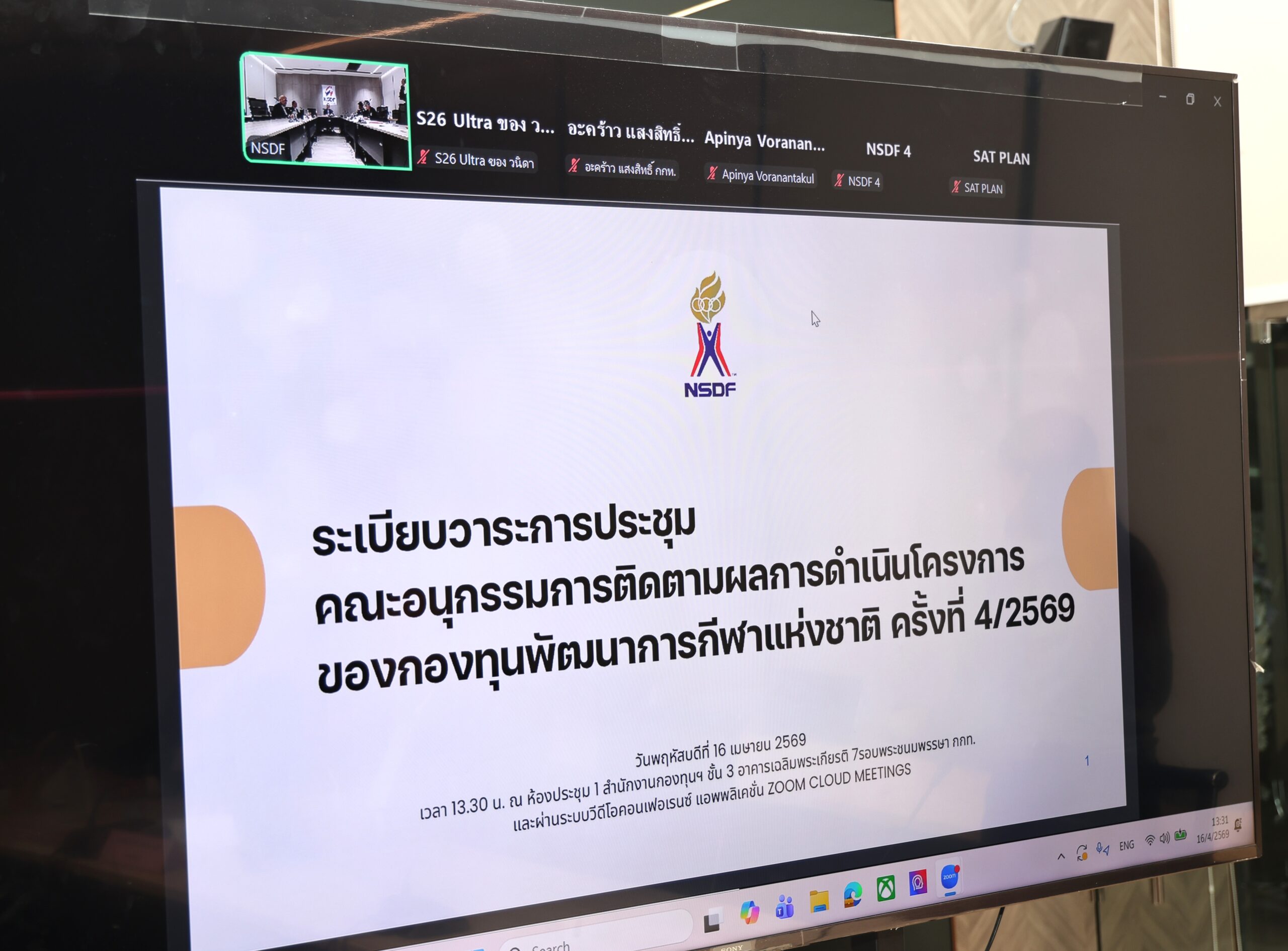 เมื่อวันที่ 16 เมษายน 2569 กองทุนพัฒนาการกีฬาแห่งชาติ จัดประชุมคณะอนุกรรมการติดตามผลการดำเนินโครงการ ครั้งที่ 4/2569 ณ ห้องประชุม 1 ชั้น 3 สำนักงานกองทุนพัฒนาการกีฬาแห่งชาติ อาคารเฉลิมพระเกียรติ 7 รอบ พระชนมพรรษา การกีฬาแห่งประเทศไทย และผ่านระบบวิดีโอคอนเฟอเรนซ์